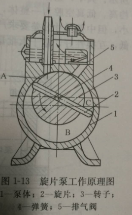 旋片泵的旋片把转子、泵腔和两个端盖所围成的月牙形空间分隔成A、B、C三部分,当转子按箭头方向旋转时,与吸气口相通的空间A的容积是逐渐增大的,正处于吸气过程。而与排气口相通的空间C的容积是逐渐缩小的,正处于排气过程。居中的空间B的容积也是逐渐减小的,正处于压缩过程。由于空间A的容积是逐渐增大(即膨胀),气体压强降低,泵的入口处外部气体压强大于空间A内的压强,因此将气体吸入。当空间A与吸气口隔绝时,即转至空间B的位置,气体开始被压缩,容积逐渐缩小,最后与排气口相通。当被压缩气体超过排气压强时,排气阀被压缩气体推开,气体穿过油箱内的油层排至大气中。由泵的连续运转,达到连续抽气的目的。