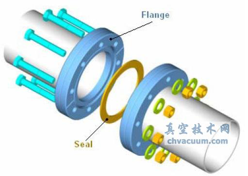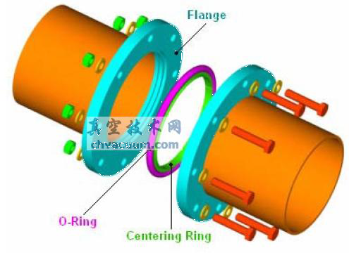 b、ISO-F真空接头通常由法兰(flang)、密封圈(O-Ring)、中心定位环 (centering ring) 组成,与ISO-K不同的地方是法兰用螺栓坚固。见下图。