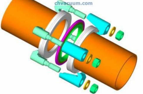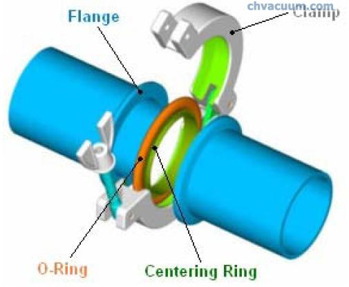 a、ISO-K真空接头通常由法兰(flang)、法兰爪(clamp)、密封圈(O-Ring)、中心定位环 (centering ring) 组成,见下图。