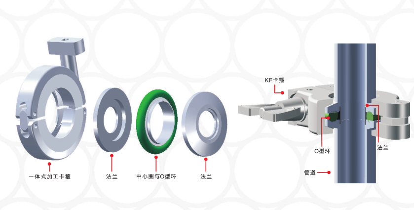 使用NW 法兰时,两个 NW 法兰中间安装有外套O形橡胶圈的中心支架,外侧通过卡箍可简单实现快速的安装和拆卸(图1)。使用氟橡胶圈的时候,烘烤温度一般可达150℃。