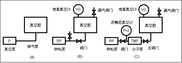 图A是最简单的例子。真空系统的压力比周围的大气压低,因此必须要有一个密封的容器。这个容器被称为真空腔。要使真空腔内成为真空状态,必须使用排气泵来排气。因此真空腔和排气泵即成为最单纯的真空设备例子。