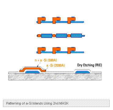 TFT岛包括:SiNx,a-Si,n+ a-Si等层。PECVD分步形成,膜厚约为2000埃。只需一次干刻。(图2参考)
