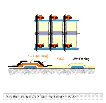 第三道工序:简称D工程。制作源极、漏极(S/D)。在源漏极与TFT岛之间要形成一层n+ a-Si,主要是确保非晶层与源漏极之间为欧姆接触。信号线加在源极上。S/D电极主要由钼/铝/钼三层膜组成,膜厚500/2000/500埃,PVD法形成。此时的曝光强度为28mj/cm2。