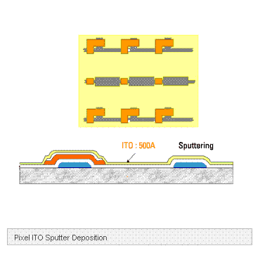 第五道工序:简称PI工程。形成ITO透明像素电极。ITO像素电极覆盖漏极,公共电极和存储电容。PVD法ITO溅射成膜(膜厚500埃),3.4%的草酸刻蚀。(图4参考)