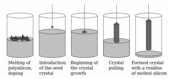 首先,将前面所获得的高纯度多晶硅融化,形成液态的硅。之后,以单晶的硅种(seed)和液体表面接触,一边旋转一边缓慢的向上拉起。至于为何需要单晶的硅种,是因为硅原子排列就和人排队一样,会需要排头让后来的人该如何正确的排列,硅种便是重要的排头,让后来的原子知道该如何排队。最后,待离开液面的硅原子凝固后,排列整齐的单晶硅柱便制作完成。硅棒基本制作流程参考下图。