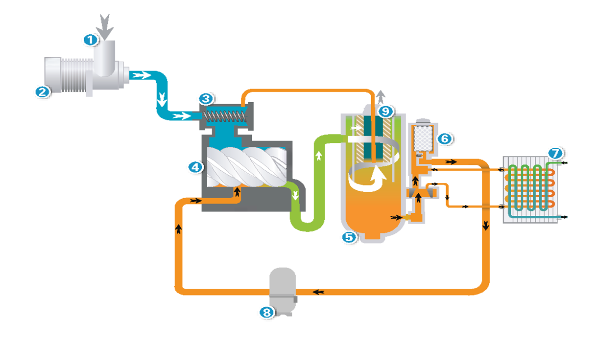 1.进气口 2.空气过滤器 3.进气阀 4.机体 5.油气分离器6.油过滤器 7.油冷却器 8.循环油泵 9.油气分离滤芯。