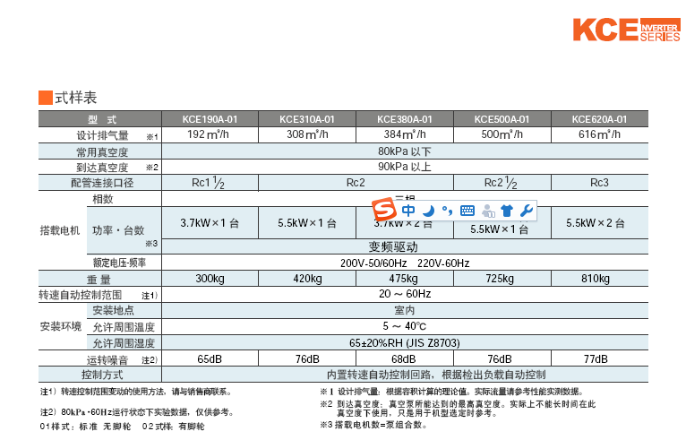 5、 KCE系列真空机组在KCP的单泵优越性能上,进行机组搭配,提高机组的抽速,搭载变频控制和运转台数程序控制,组合成智能系统。