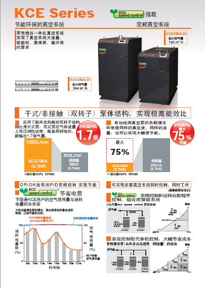 6、 ORION KCE爪式真空机组自动检测真空泵的负载情况即使是同样的真空泵,同样的流量,也可以实现大幅度节能。